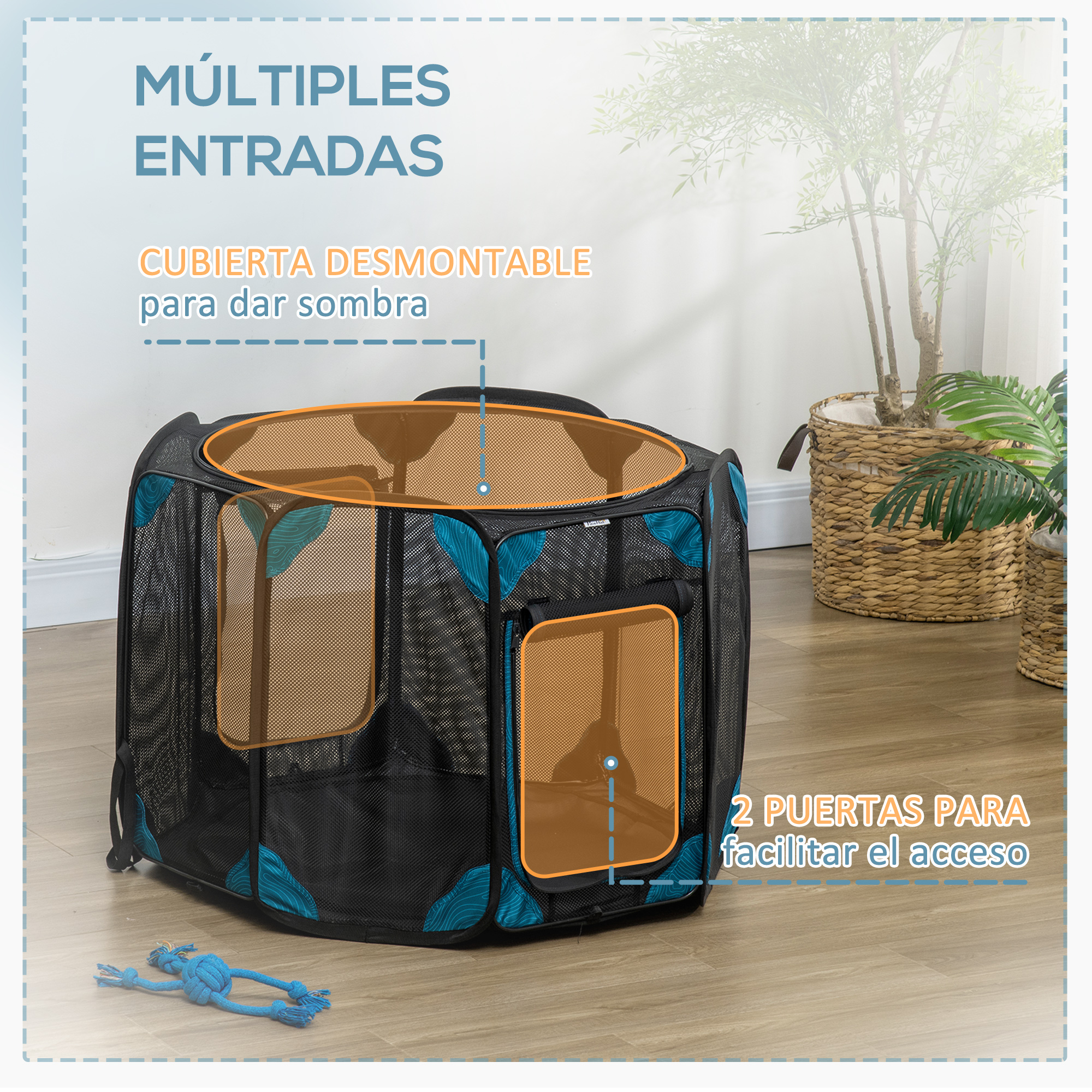 Esta elegante cerca para cachorros de PawHut es ideal para mantener a salvo a tu perro, gato o cualquier animal pequeño. Cuenta con una estructura de acero, paneles con tejido Oxford y malla transpirable para una mayor ventilación y visibilidad, 2 puertas con cremallera para facilitar el acceso al interior y una bolsa de transporte para mover cómodamente y llevarlo a todas partes. Es ideal para que tu amigo peludo juegue y se divierta mientras está seguro. Características: Recinto para perros plegable y portátil Fabricado con estructura de acero y tejido Oxford 600D resistente al agua Adecuado para perros miniatura y pequeños (hasta 10 kg, 38 cm de altura del hombro), gatos, conejos, cobayas y otros animales pequeños Tiene 2 puertas con cremallera para facilitar el acceso La parte inferior y la superior se pueden desmontar El tejido de malla proporciona una mayor ventilación y visibilidad Fácil de limpiar con un paño húmedo Se incluyen 4 estacas de tierra para fijar en el suelo para mayor estabilidad Se incluye una bolsa de transporte para guardarlo y transportarlo rápidamente Especificaciones: Color: azul y negro Material: tejido Oxford, malla y acero Medidas totales: Ø91×58 cm (DxAL) Medidas de cada panel: 35×58 cm (LxAN) Medidas de la puerta: 25×44 cm (LxAN) Medidas plegadas: 65x39x5 cm (LxANxAL) Referencia: D06-165V00BU El paquete incluye: ● 1 x Parque para mascotas; ● 1 x Bolsa de transporte; ● 4 x Estaca de tierra