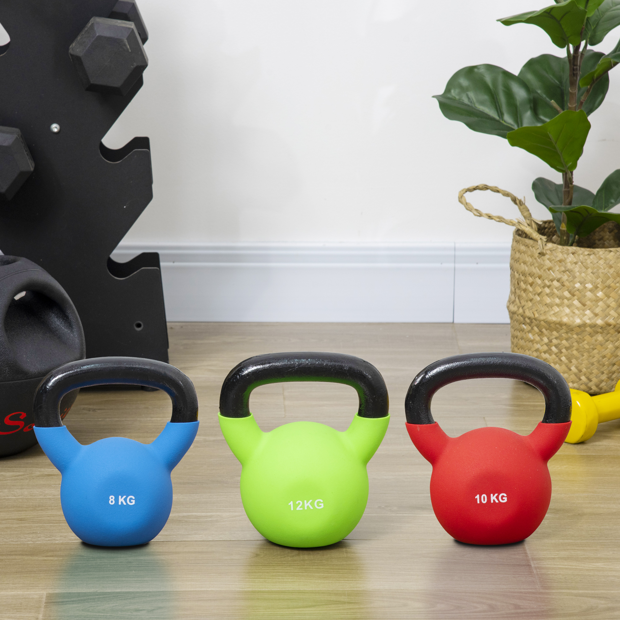 HOMCOM Conjunto de 3 Pesas Rusas de 12 kg 10 kg 8 kg Kettlebell con Revestimiento de Neopreno Mango Ancho para Ejercicios y Entrenamiento 20x13x23 cm 19x12x22 cm 18x11x20 cm Verde Rojo y Azul