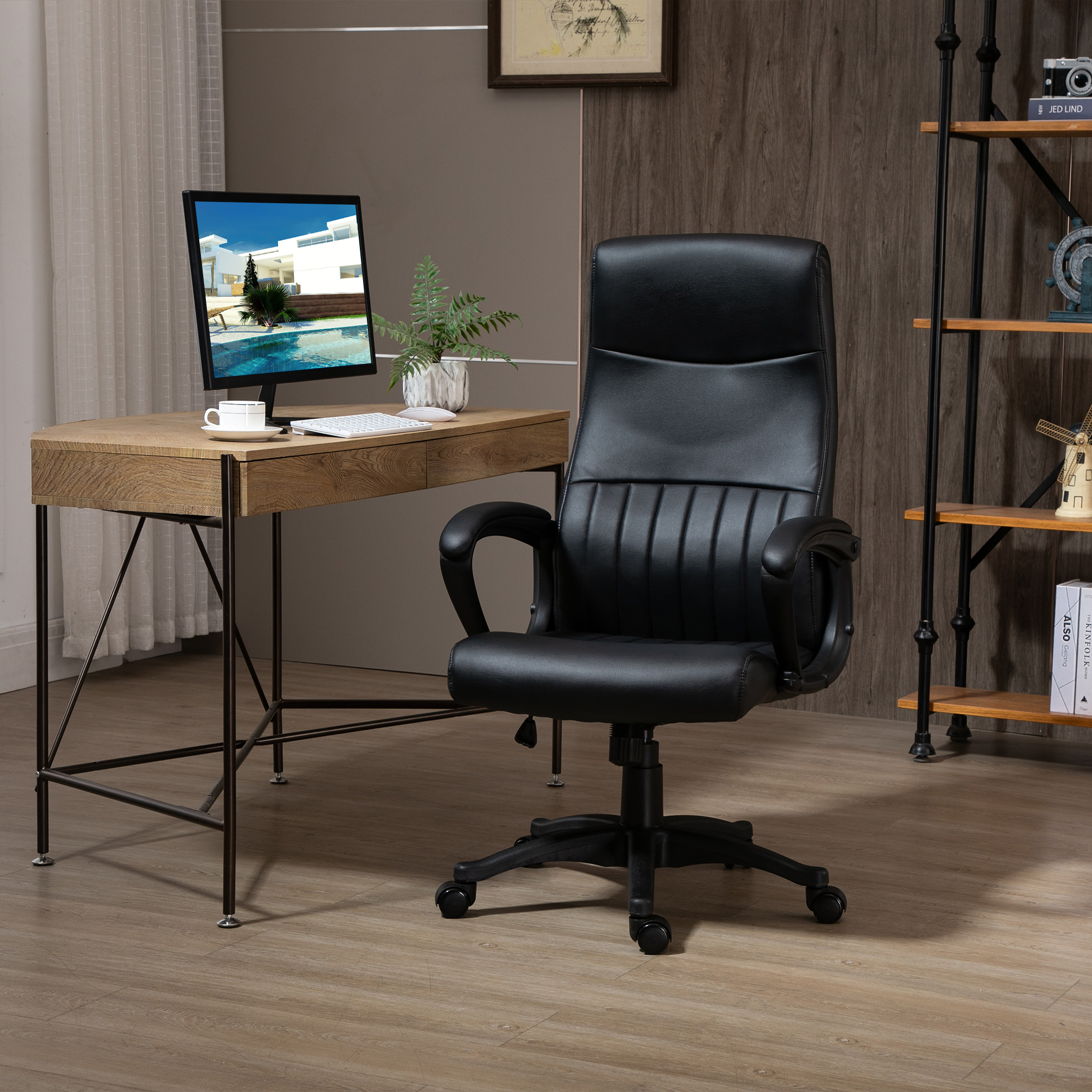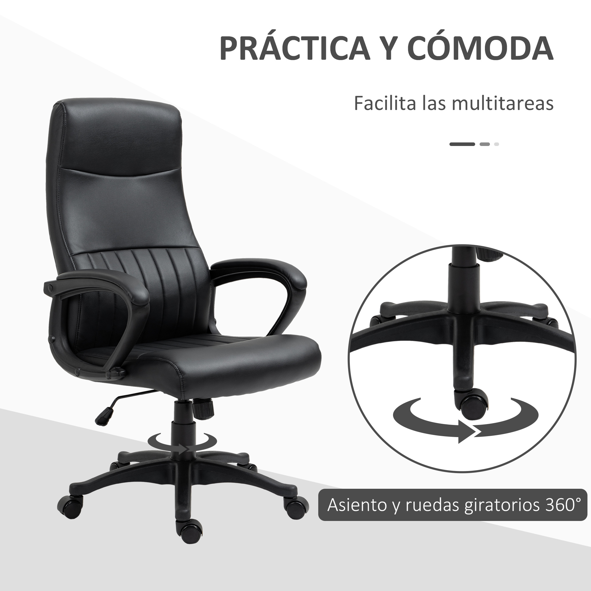 Vinsetto Silla de Oficina Ergonómica Silla de Escritorio Basculante y Giratoria 360° con Altura Ajustable Respaldo Alto y Reposabrazos Piel Sintética 61,5x66x113-123 cm Negro