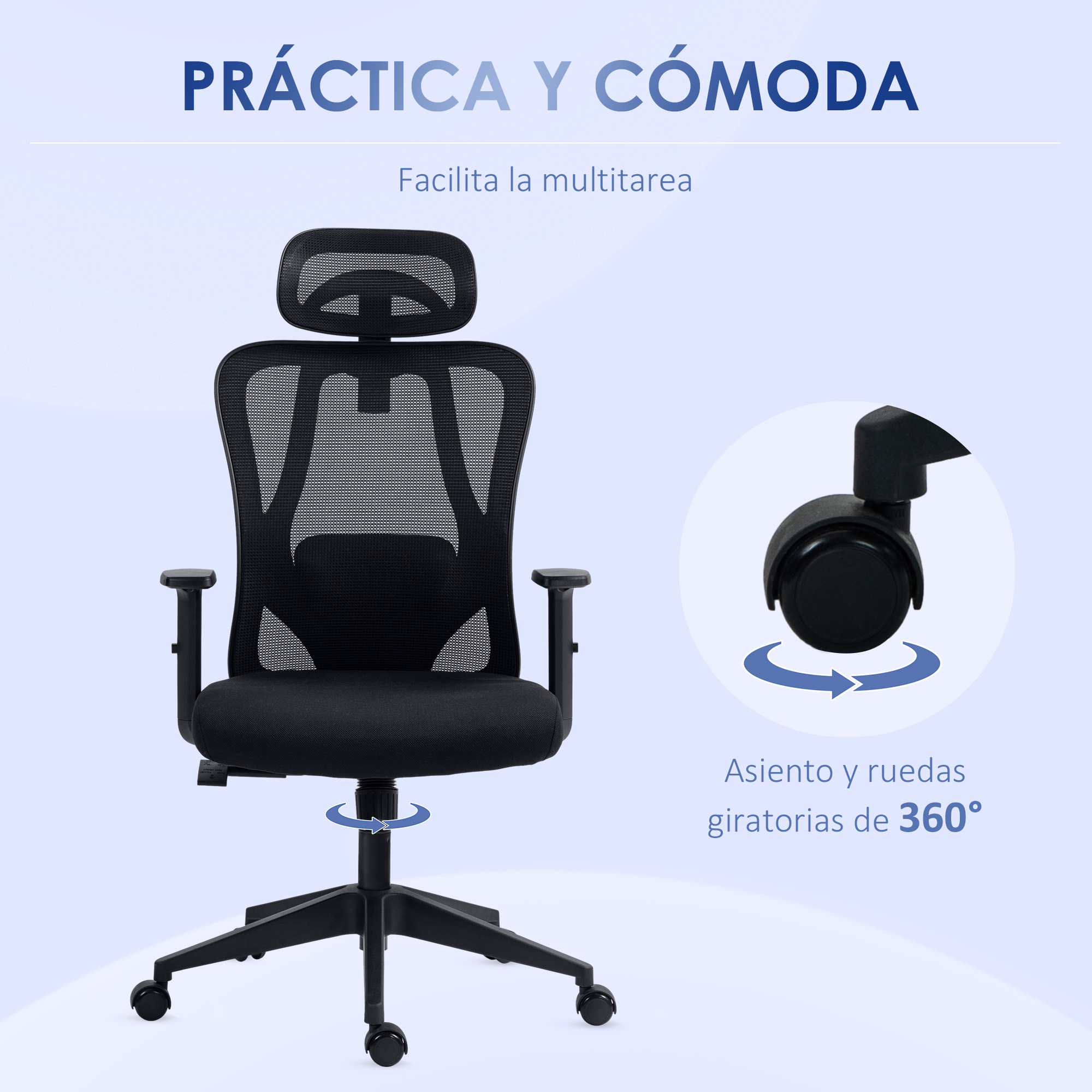 Si lo que deseas es poder estar cómodo y relajado en tu oficina, lugar de trabajo u hogar, esta silla ergonómica de escritorio de Vinsetto es lo que necesitas. Cuenta con un diseño ergonómico, reposacabezas, reposabrazos y soporte lumbar regulables. Es una silla de despacho que se adapta a la perfección a tu cuerpo para ofrecerte un asiento cómodo. Se puede ajustar en altura y es basculante. Y lo mejor es su respaldo alto de malla transpirable ¡En definitiva, la silla ideal para tu hogar u oficina! Características: Silla de ordenador con respaldo curvo de malla transpirable y asiento acolchado Función basculante para inclinarse hacia delante y atrás siempre manteniendo el ángulo entre el asiento y el respaldo Reposabrazos 2D, ajustable hacia arriba y hacia abajo Silla de estudio con altura regulable para ajustar a tus hábitos de sentado y medidas del escritorio El reposacabezas puede ajustar hacia arriba-abajo y gira Estructura del respaldo con soporte lumbar regulable en altura para mejor el apoyo de la espalda Con base de 5 ruedas para mayor estabilidad y libertad de movimiento y asiento giratorio de 360° Se requiere montaje Especificaciones: Color: negro Material: espuma, nylon, malla (poliéster) y metal Medidas totales: 67x64x117-127 cm (LxANxAL) Medidas del asiento: 51x52x45-55 cm (LxANxAL) Medidas del respaldo: 53×59 cm (LxAL) Altura del reposabrazos al asiento: 21,5-28,5 cm Medidas del soporte lumbar: 31×15 cm (LxAN) Medidas del reposacabezas: 41×16 cm (LxAN) Rango ajustable del reposacabezas: 4 cm Carga máxima: 120 kg Referencia: 921-489 El paquete incluye: ● 1 x Silla de oficina; ● 1 x Manual de instrucciones
