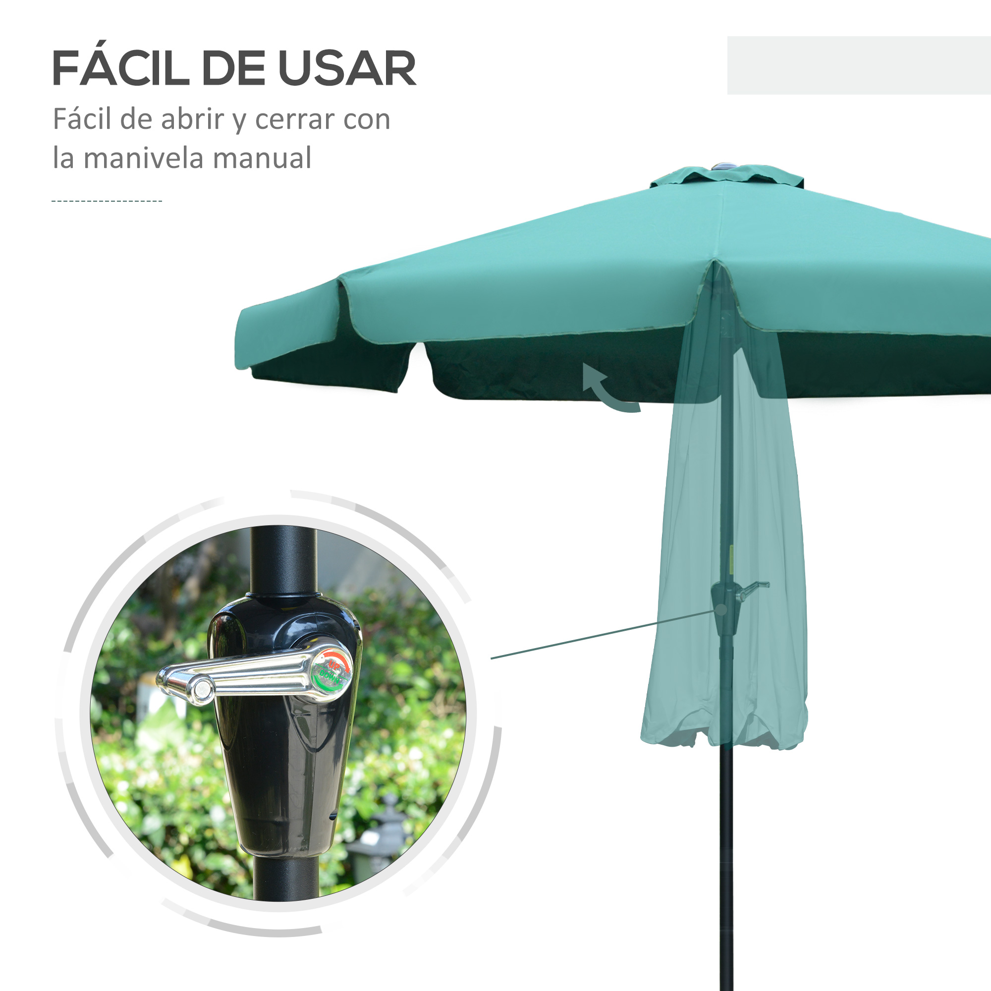 ¿Estás buscando una sombrilla práctica y elegante para tu jardín o terraza? Este modelo de Outsunny es ideal. Con estructura metálica y toldo de tela de poliéster con ventilación y protección UV +50, es resistente e ideal para un uso prolongado a la intemperie. Se abre fácilmente mediante una manivela y se puede reclinar gracias a su mástil con ángulo ajustable. ¡Disfruta de momentos agradables a la sombra junto a tu piscina, jardín o patio! Características: Sombrilla de jardín con toldo con faldones decorativos Ideal para jardín, patio, terraza, piscina o cualquier otro espacio al aire libre Apertura manual rápida y fácil mediante una manivela Parasol de jardín con marco de metal y aluminio con 8 varillas para mayor estabilidad y resistencia Toldo de poliéster resistente a la intemperie y a la decoloración, impermeable y con protección anti UV50+ Poste con mecanismo de inclinación para poder orientar el toldo de la sombrilla según la incidencia de los rayos solares Requiere montaje IMPORTANTE: La base de la sombrilla NO está incluida Especificaciones: Color: verde Material: aluminio, metal y tela de poliéster de 200 g/m² UV50+ Medidas totales: Ø266×248,5 cm (DxAL) Diámetro del mástil: Ø38 mm Número de varillas: 8 Referencia: 84D-157GN El paquete incluye: ● 1 x Sombrilla de terraza; ● 1 x Manual de instrucciones