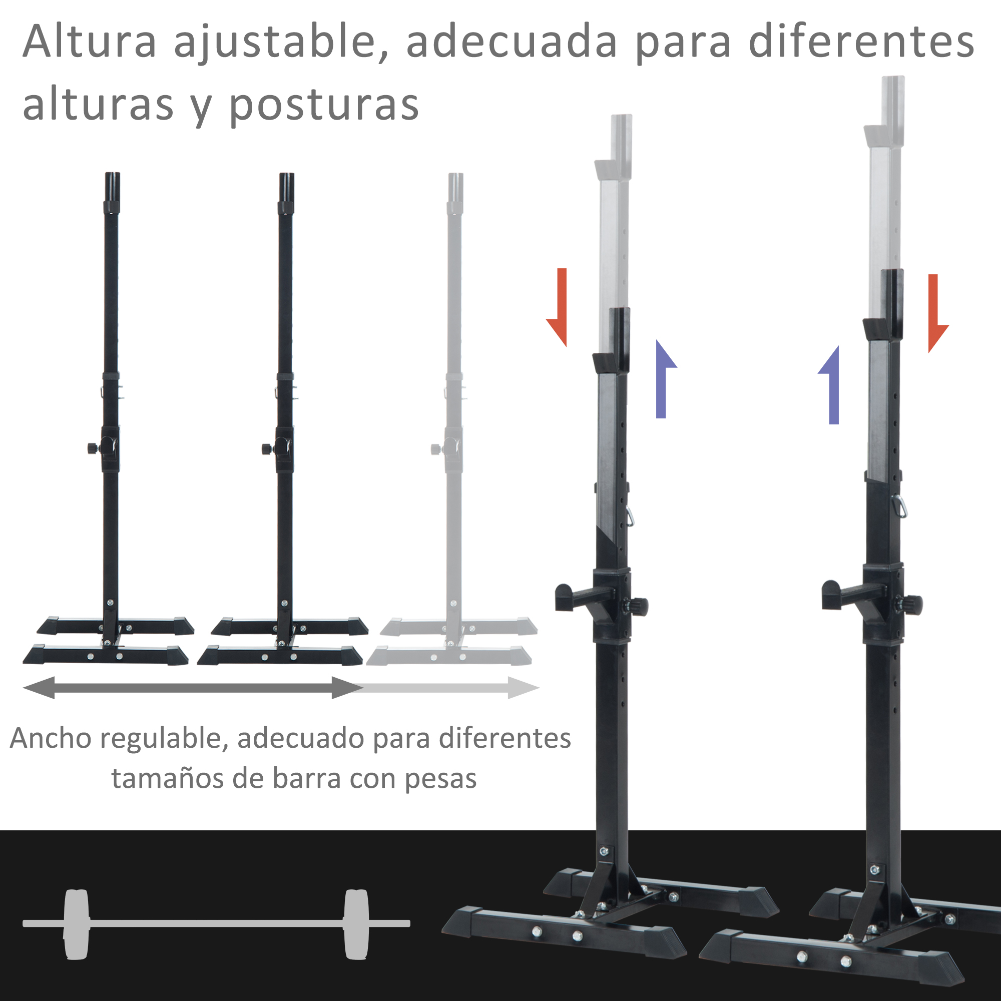 Disfruta de tus entrenamientos en casa con este par de soportes para barras de pesas de HOMCOM. Hechos de acero resistente, pueden soportar un total de 150 kg en conjunto. Al poderse regular en altura, son ideales para personas de diferentes estaturas y constitución física. Para colocar un máximo de 2 barras. Gana fuerza, masa ósea y quema calorías ejercitándote en casa levantando pesas con la ayuda de este soporte para tus barras. Características: Soporte para barras de pesas compuesto de 2 piezas de idénticas características Estructura resistente de acero con una capacidad máxima de carga de 150 kg en total Los soportes cuentan con un gancho para ajustar la altura El levantamiento de pesas ofrece múltiples beneficios para el cuerpo, como el aumento de tono muscular, mejora de masa ósea y de la salud Patas con tapas antideslizantes para evitar que los soportes se muevan para mayor seguridad y protección del suelo Bases robustas con marco triangular reforzado y patas en forma de H para mayor estabilidad Perfecto para usar durante la práctica de levantamiento de pesas Se requiere montaje Especificaciones: Color: negro Material: acero Medidas de cada soporte: 52x48x108-163 cm (LxANxAL) Carga máxima: 150 kg Referencia: B1-0056 El paquete incluye: ● 2 x Soporte para barras de pesas; ● 1 x Manual de instrucciones