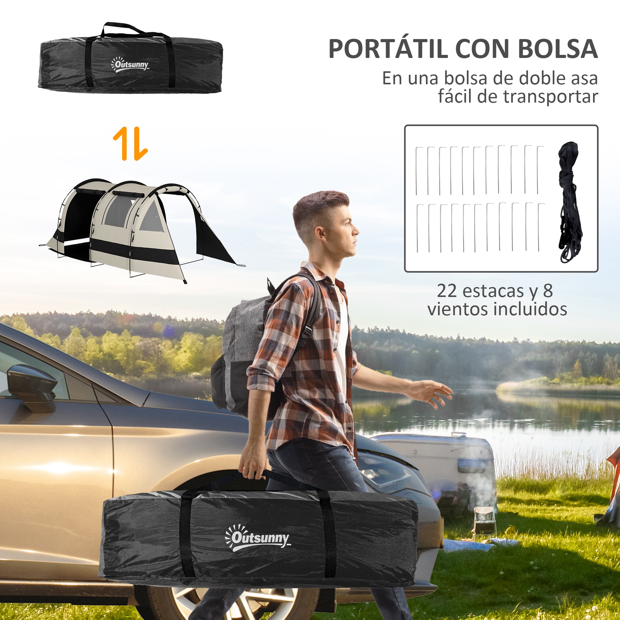 Disfruta de la diversión de acampar con compañía. Esta tienda de campaña familiar Outsunny de 2 habitaciones cuenta con un dormitorio y una sala intermedia, con capacidad para 4-5 personas. Los postes de fibra de vidrio aseguran una estructura firme, y la cubierta ofrece una buena resistencia al agua por si llueve. Características: Tienda de campaña grande adecuada para 4-5 personas, con dos espacios diferenciados El cuarto opaco permite dormir cómodamente durante el día Incluye un gancho para colgar una linterna y proporcionar iluminación durante la noche Con múltiples entradas y ventanas para un fácil acceso, ventilación y visibilidad La tienda está fabricada con poliéster resistente al agua de 3000 mm, lo que garantiza un interior seco incluso cuando llueve Se incluyen 22 estacas de tierra y 8 tensores para fijarla firmemente en el suelo Especificaciones: Color: caqui y naranja Material: tejido de poliéster, fibra de vidrio, PE Medidas totales: 460x230x180 cm (LxANxAL) Medidas plegada: 60x19x19 cm (LxANxAL) Medidas del dormitorio: 210x210x170 cm (LxANxAL) Medidas de la sala de estar: 250x230x180 cm (LxANxAL) Medidas de las puertas: 100×130 cm, 100×150 cm, 140×200 cm, 105×170 cm (LxAL) Medidas de la ventana: 90×85 cm (LxAL) Carga máxima del gancho: 1 kg Índice de impermeabilidad: 3000 mm Referencia: A20-405V01KK El paquete incluye: ● 1 x Tienda de campaña; ● 22 x Estaca de tierra; ● 8 x Cuerda tensora; ● 1 x Bolsa de transporte; ● 1 x Manual de instrucciones