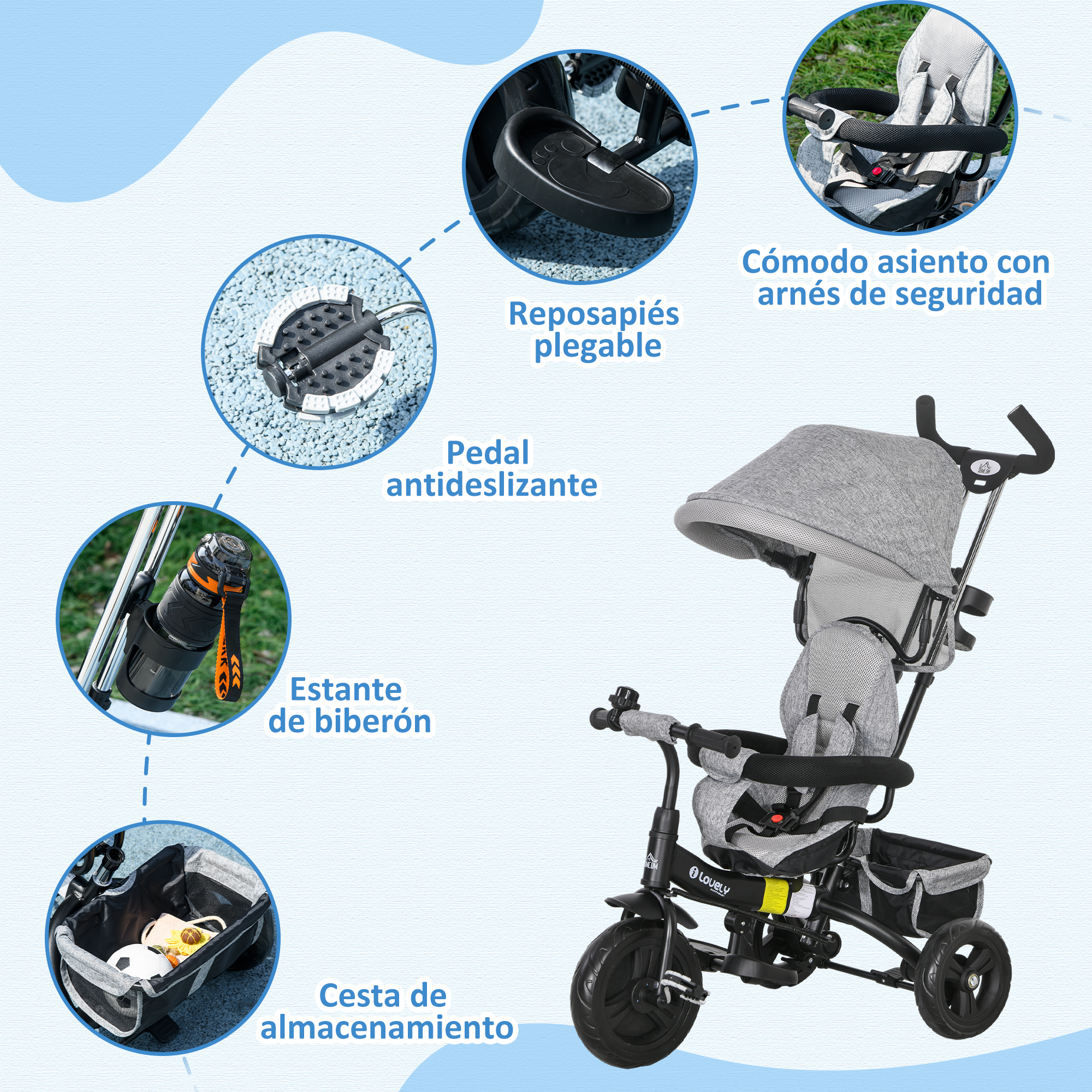 HOMCOM Triciclo Evolutivo para Bebés 6 en 1 Triciclo para Niños de 1-5 Años Bicicleta para Niños con Toldo Plegable Mango Telescópico Desmontable Cinturón de Seguridad y Cesto 95x50x106 cm Gris