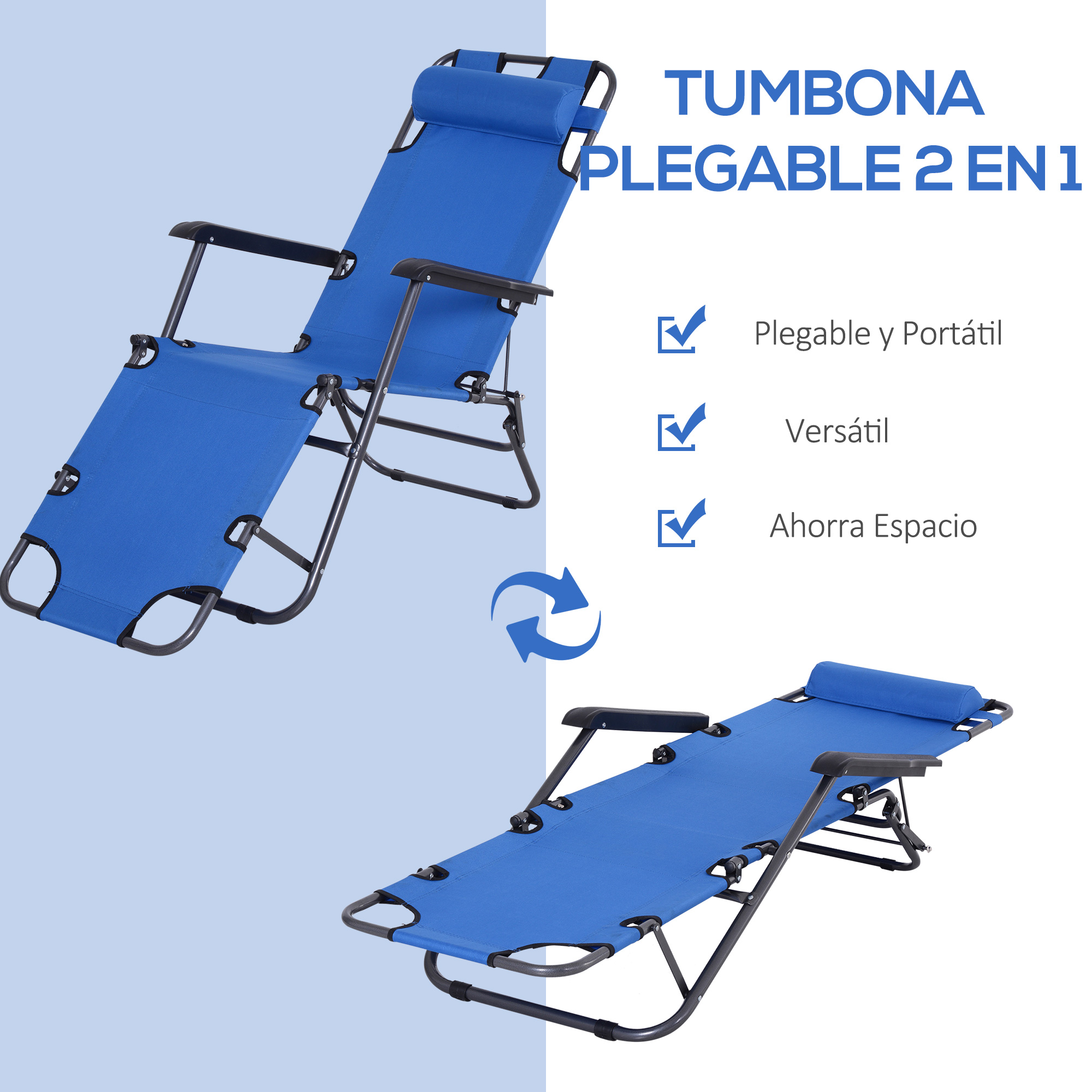 Outsunny Tumbona Reclinable y Plegable Silla de Playa Tumbona Relax Plegable con Respaldo Ajustable en 2 Niveles Reposabrazos Almohada y Reposapiés para Jardín Balcón Carga 136 kg 135x60x89 cm Azul