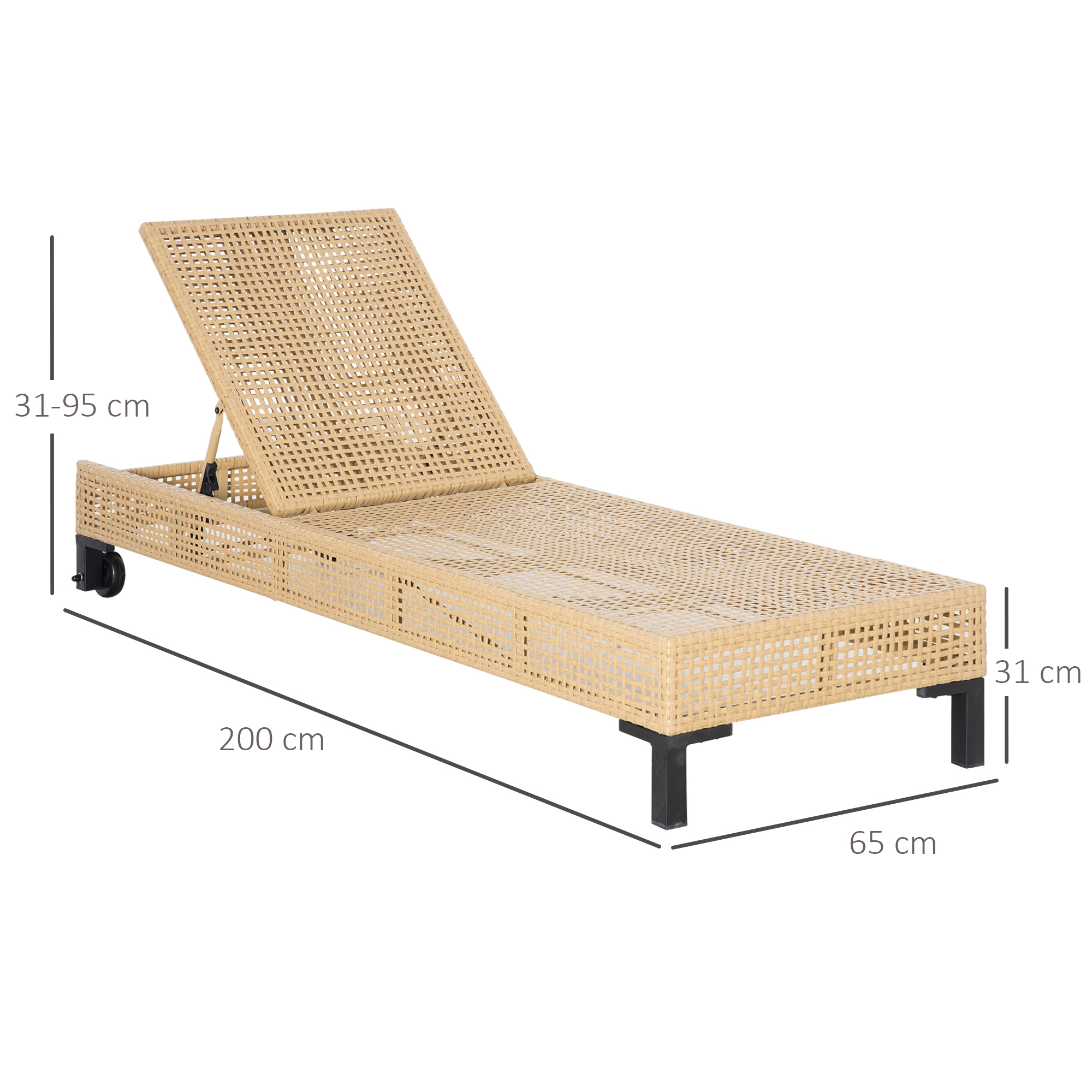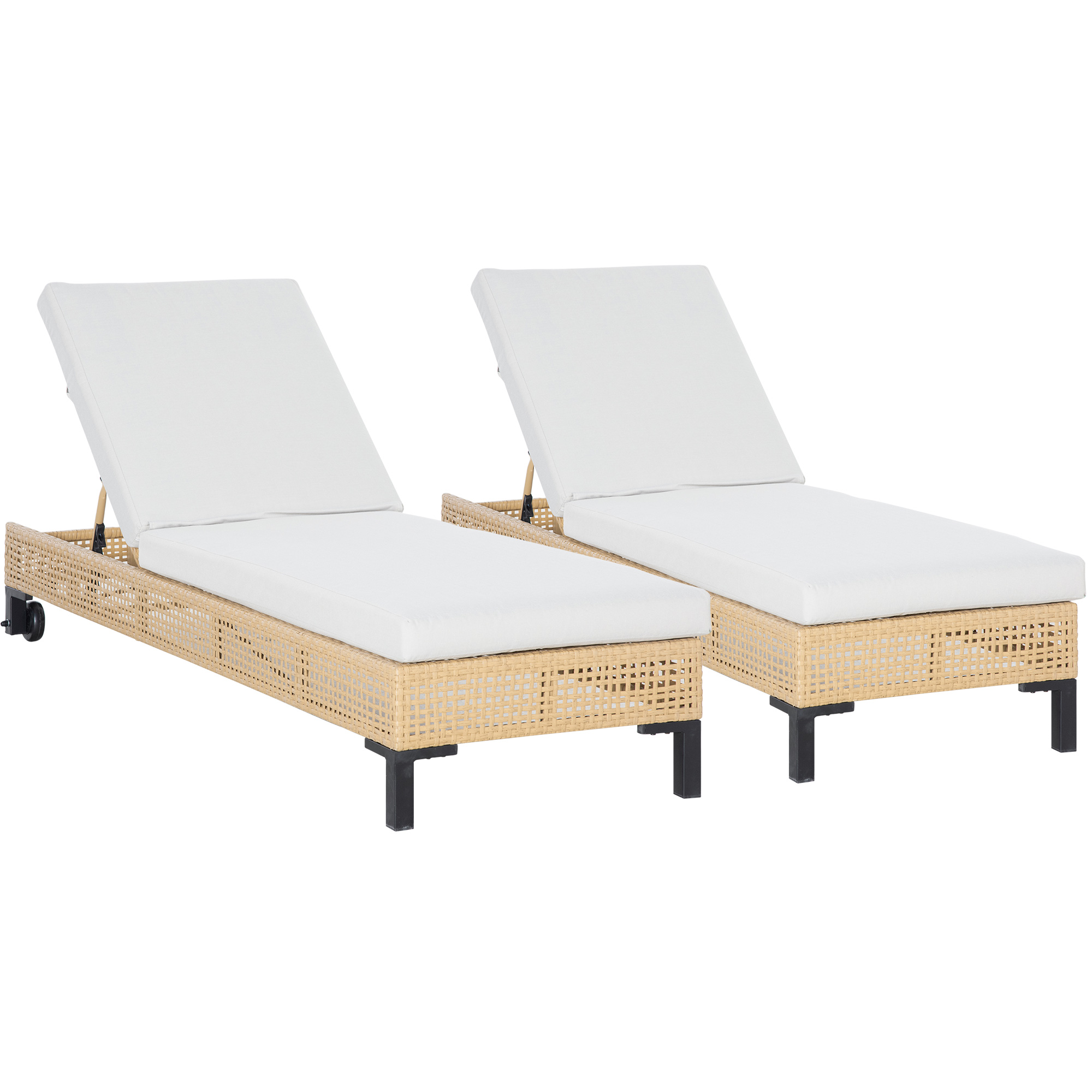 Outsunny Conjunto de 2 Tumbonas de Jardín Exterior de Ratán Sintético Tumbonas con Ruedas Respaldo Ajustable en 5 Posiciones y Cojín Acolchado 200x65x31 cm Natural y Beige