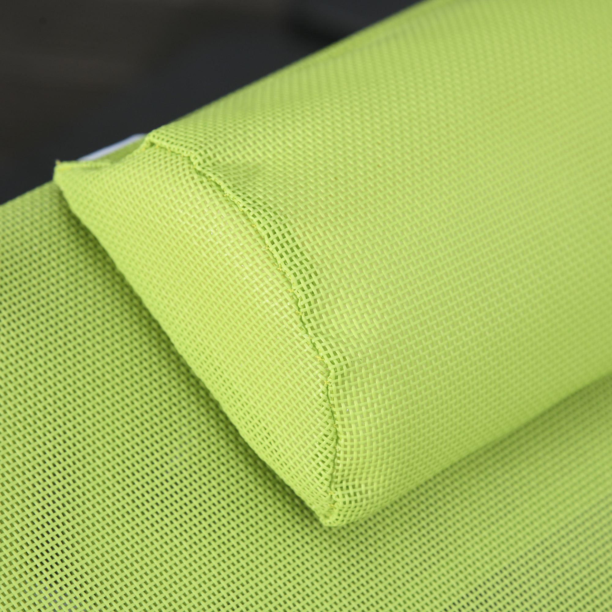 Este pack de dos tumbonas plegables de Outsunny es ideal para tumbarse bajo el sol en la playa, terraza o piscina. Los respaldos se reclinan en 5 posiciones diferentes y tienen cojines reposa-cabezas desmontables, para que los uses o no según tus gustos y/o necesidades. Sus estructuras de acero y a la vez ligeras, son capaces de soportar hasta 120 kilos cada una. Y el tejido de texteline es transpirable y resistente a la intemperie y rayos UV. ¡Disfruta de un merecido descanso en compañía! Características: Pack de dos tumbonas de diseño moderno y actual, con cómodos reposa-cabezas Estructura de acero tubular con recubrimiento en polvo para mayor resistencia Ideal para el jardín, patio, terraza, piscina… o para llevártelas a la playa, de camping o a cualquier espacio al aire libre Reposa-cabezas acolchados y desmontables, para mayor comodidad Respaldo con altura ajustable en 5 posiciones, desde 90° hasta 180° Para usarlas como sillas o como camas completamente planas Su diseño plegable ahorra espacio y facilita su transporte y almacenaje Especificaciones: Color: verde Material: metal, texteline Medidas totales: 182x56x24,5 cm (LxANxAL)(cada tumbona) Las 5 posiciones del respaldo: 24,5 cm (180°), 51 cm, 67 cm, 80 cm y 86 cm (90°) Medidas plegadas: 67x57x8 cm (LxANxAL) Medidas del reposacabezas: 26x13x6 cm (LxANxAL) Longitud del respaldo: 60 cm Carga máxima: 120 kg (cada una) Cumplen con: EN 581-1-2 Referencia: 84B-P196 El paquete incluye: ● 2 x Tumbona plegable (referencia: 84B-622GN); ● 2 x Cojín
