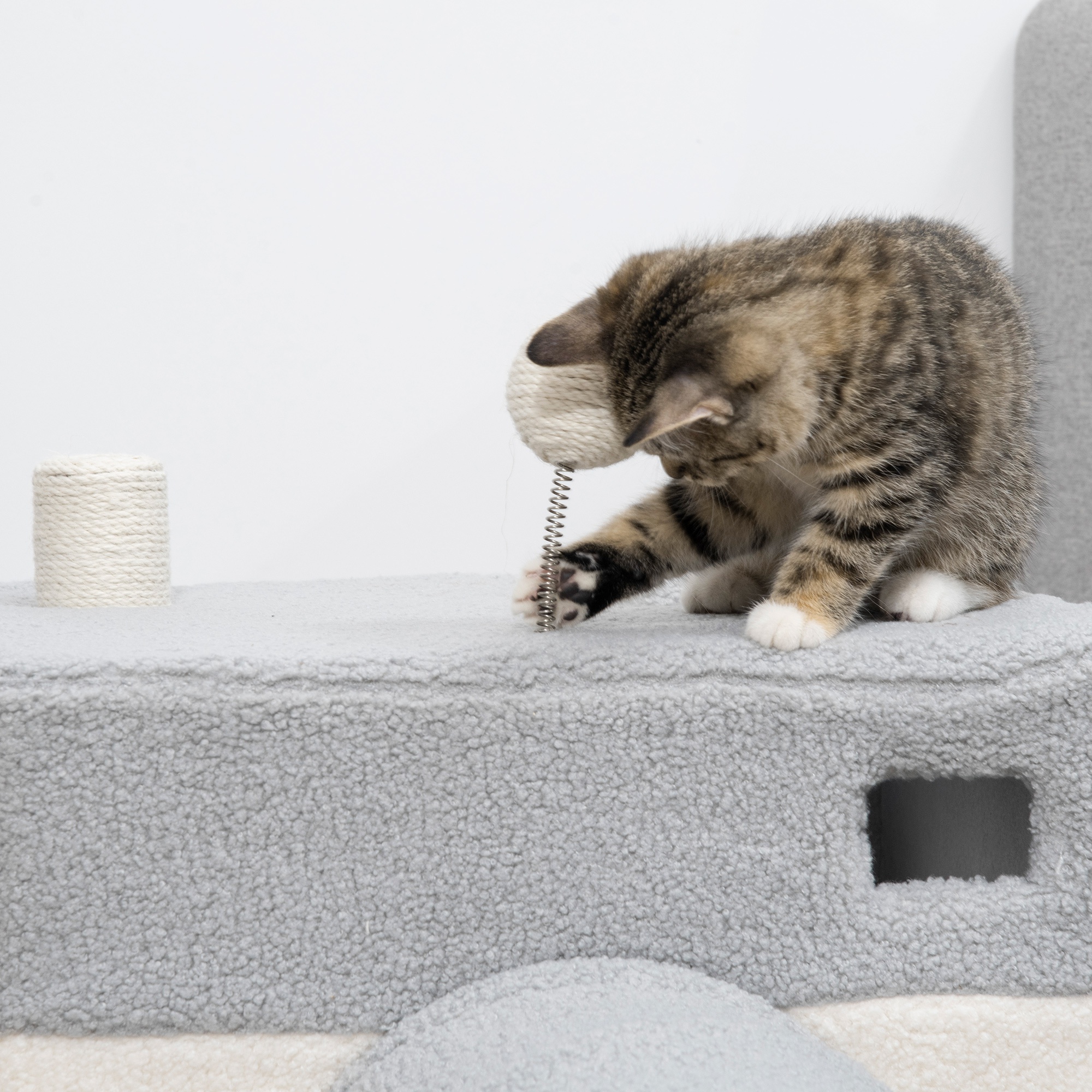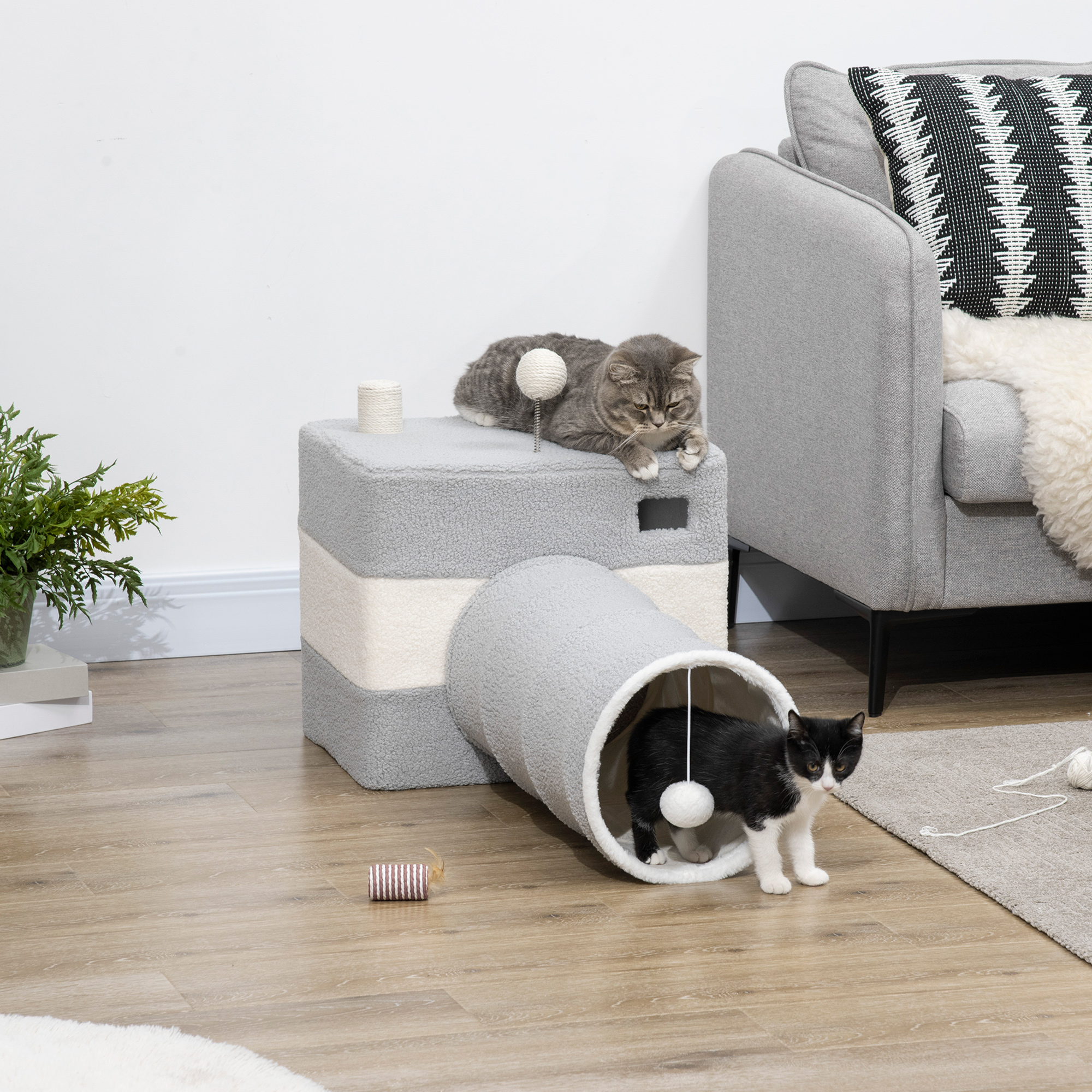 PawHut Túnel para Gatos con Cueva Tubo de Juguete para Mascotas con Orificio Superior Puerta Delantera Poste de Sisal y Bola Colgante 48x95x58 cm Gris