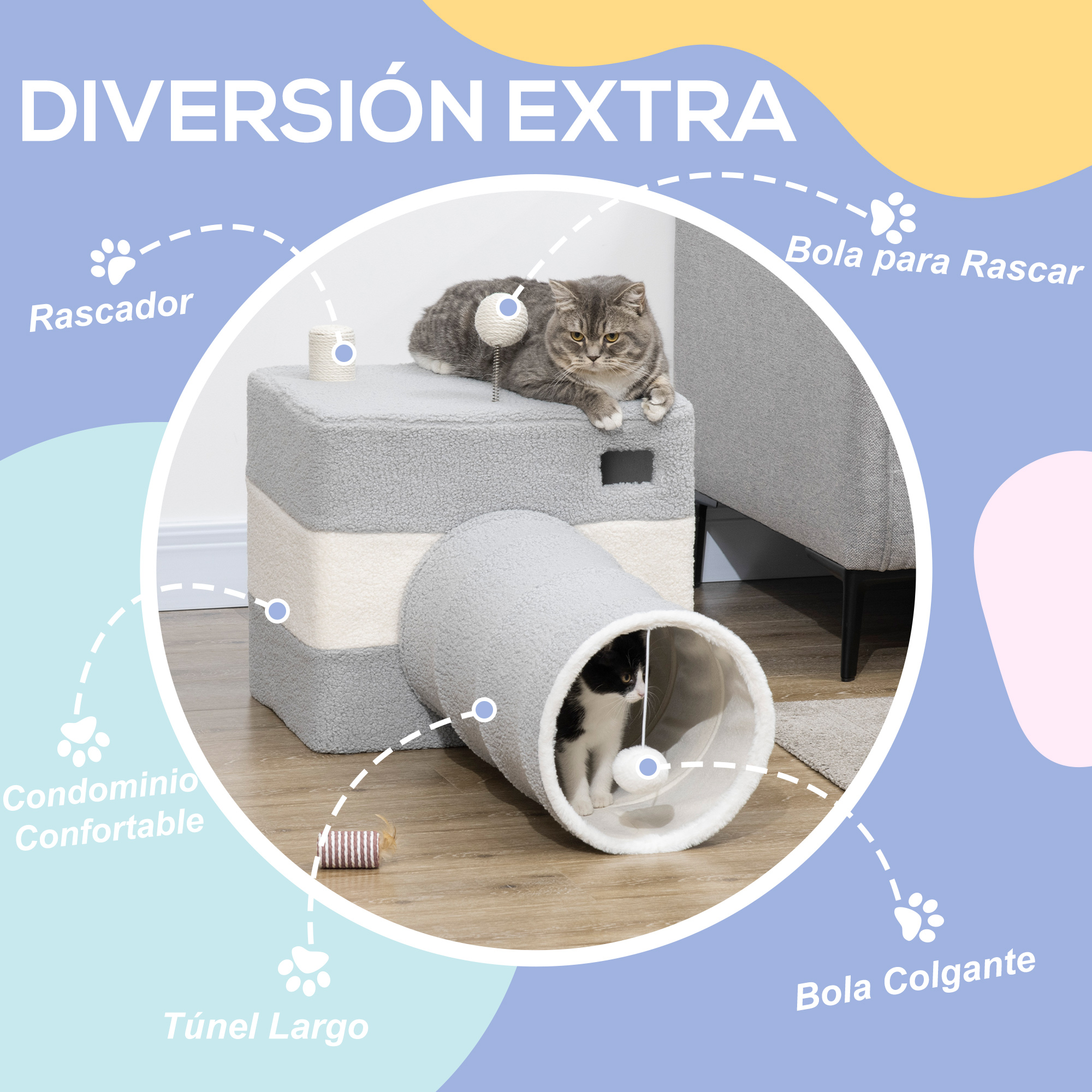 ¿Estás tratando de encontrar un juego para entretener a tus amigos felinos? Esta cueva para gatos con túnel de PawHut es perfecto. Y lo mejor, no solo es para divertirse, sino que también cuenta con una acogedora cueva para descansar. Además, tiene bolas colgantes, sisal para afilar las garras y orificios de observación. Todo esto en un mismo producto, ¡hazte con el tuyo y garantiza la diversión de tu amigo peludo! Características: Esta cama túnel para gatos es ideal para proporcionar un espacio de juego para tus amigos peludos Tiene una acogedora cueva para relajarse Los gatos pueden observar a su alrededor a través de los orificios de observación La bola colgante se suma a la diversión Fabricado en madera aglomerada duradera, ideal para uso prolongado La bola y el pequeño poste en la parte superior son ideales para que los gatos afilen sus garras Especificaciones: Color: gris y beige Material: aglomerado de madera, franela, sisal Medidas totales: 48x95x58 cm (LxANxAL) Medidas del túnel: Ø26×57 cm (DxAL) Medidas de la cueva: 47x38x41 cm (LxANxAL) Ventana frontal: 8×4,5 cm (LxAN) Hueco superior: Ø15 cm Agujero trasero: 28×19 cm (LxAN) Peso recomendado del gato: inferior a 10 kg Carga máxima: 30 kg Referencia: D34-003V00GY El paquete incluye: ● 1 x Túnel para gatos; ● 1 x Manual de instrucciones