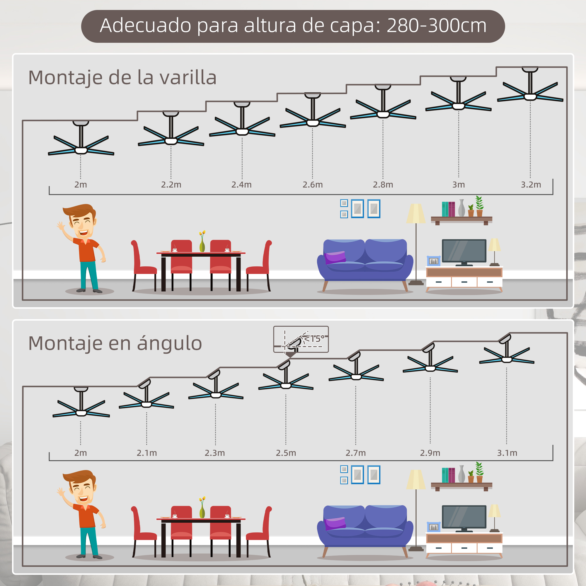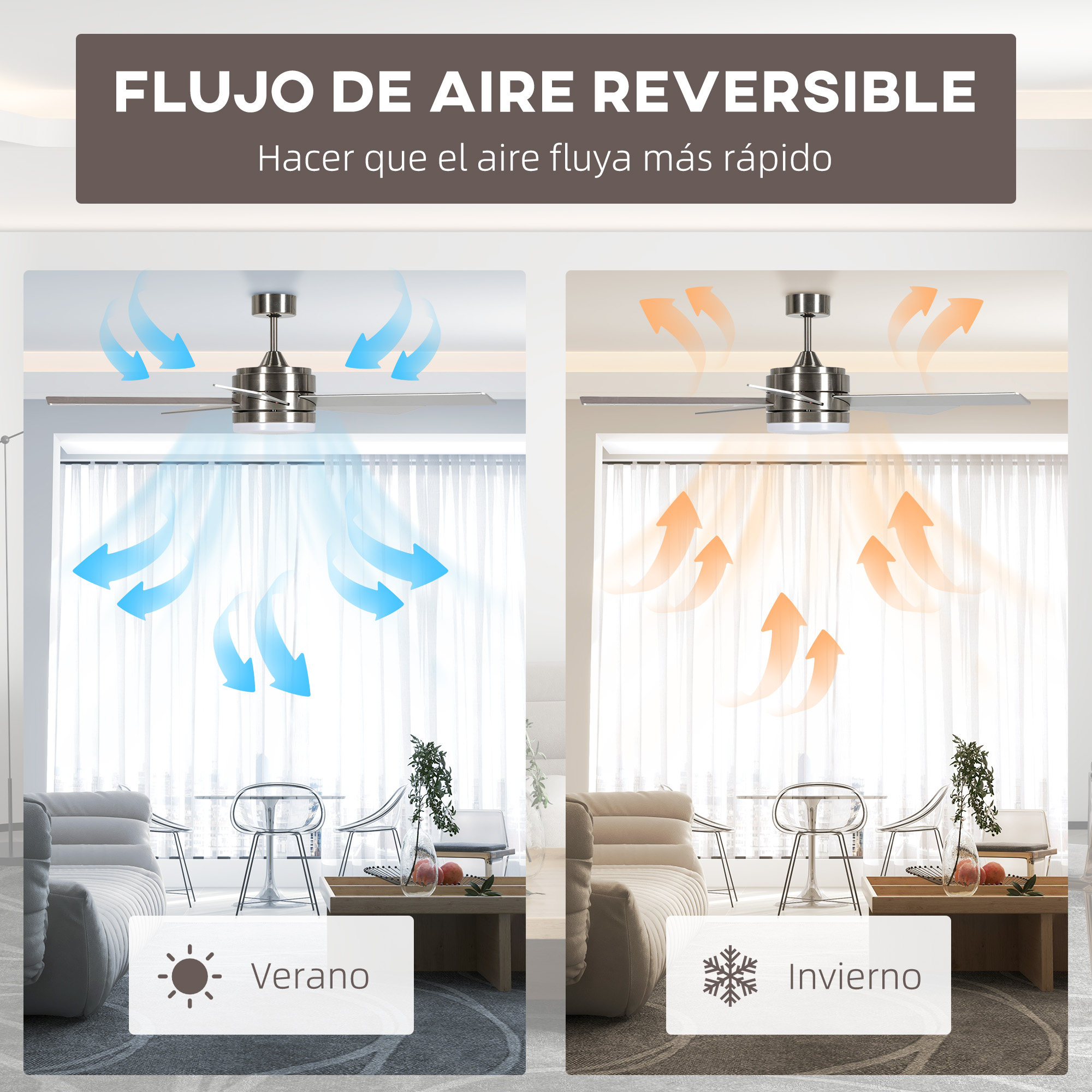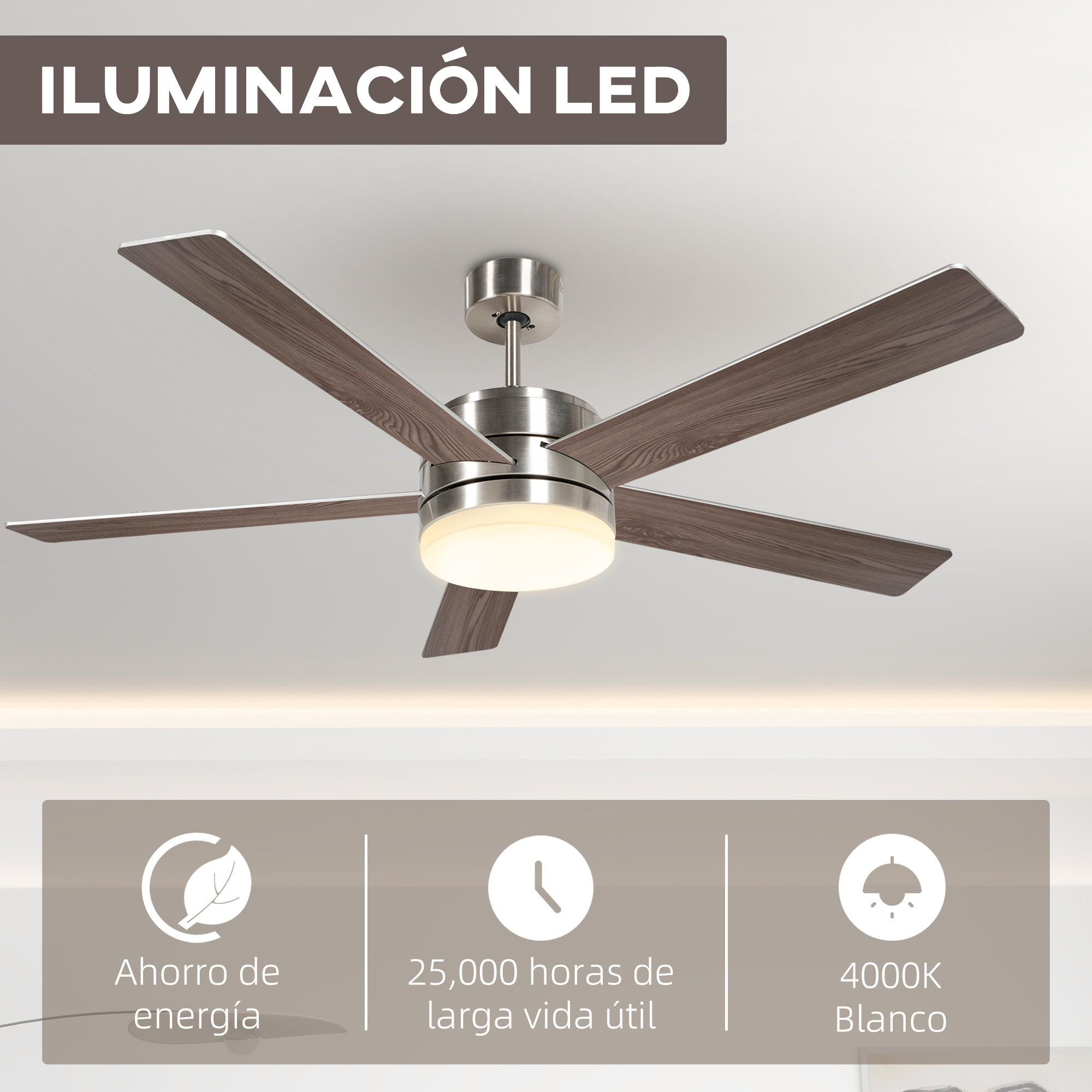 Disfruta de la comodidad que ofrece el ventilador de techo de HOMCOM, una combinación elegante y funcional para tu hogar. Con diferentes velocidades, este ventilador de techo para cocina se adapta a tus necesidades, proporcionando un ambiente fresco en verano y un aire más cálido en invierno gracias a su motor reversible. Características: Este ventilador de techo con luz puede ajustarse en seis velocidades y un modo brisa con diferentes ciclos que te proporcionan una sensación de flujo de aire natural El motor reversible ajusta el flujo de aire para el confort estacional También puedes ajustar la función de luz de protección del hogar para hacer ver que hay gente en casa y disuadir a posibles ladrones Tiene controles independientes para luz y ventilador Las aspas del ventilador de techo bajo consumo tienen apariencia moderna y natural para una añadir un toque de elegancia a tu casa Adecuado para habitaciones con techos inclinados Las palas son plateadas por un lado y de haya por el otro, para que puedas elegir la que mejor se adapte a tus gustos Especificaciones: Color: plata, imitación madera de haya Material: MDF, acrílico, metal Medidas totales: Ø132×40,5 cm (DxAL) Medidas de cada aspa: 58,2×12,7 cm (LxAN) Longitud del cable: 25 cm Adecuado para: 280-300 cm (altura del techo), 15-20 m² (área de cobertura) Ruido: 42 dB Brillo: 1600 lúmenes Temperatura de color: 4000K Voltaje: 220-240V/50Hz Potencia: 46W Pilas (mando a distancia): 2 pilas AAA (no incluidas) Referencia: B31-481V00SR El paquete incluye: ● 1 x Ventilador de techo con luz; ● 1 x Mando a distancia; ● 1 x Kit de montaje; ● 1 x Manual de instrucciones