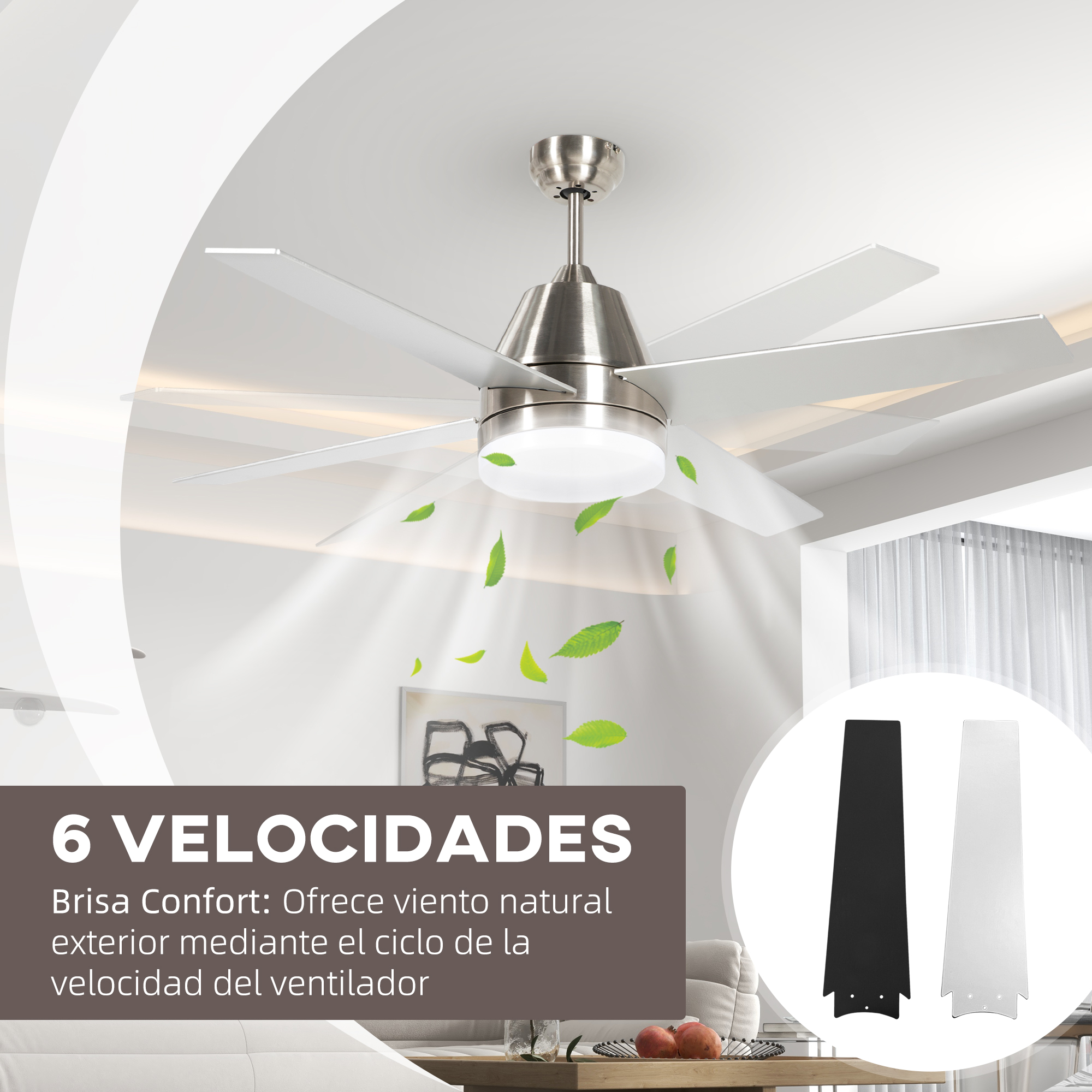 Disfruta de la comodidad y frescura que ofrece el ventilador de techo con luz de HOMCOM, una combinación elegante y funcional para tu hogar. Con diferentes velocidades, este ventilador se adapta a tus necesidades, proporcionando un ambiente fresco en verano y un aire más cálido en invierno gracias a su motor reversible. Características: Este ventilador de techo con luz puede ajustarse en seis velocidades y un modo brisa con diferentes ciclos que te proporcionan una sensación de flujo de aire natural El motor reversible ajusta el flujo de aire para el confort estacional También puedes ajustar la función de luz de protección del hogar para hacer ver que hay gente en casa y disuadir a posibles ladrones Las aspas del ventilador son de dos colores para una añadir un toque de elegancia a tu casa y que puedas elegir cuál destacar Diseño de conexión por cable, requiere una instalación profesional. La fuente de luz se puede sustituir Adecuado para habitaciones con techos inclinados Especificaciones: Color: plata, negro Material: MDF, acrílico Medidas totales: Ø129×45 cm (DxAL) Medidas de cada aspa: 57,5×15 cm (LxAN) Longitud del cable: 25 cm Adecuado para: 280-300 cm (altura del techo), 15-20 m² (área de cobertura) Ruido: 42 dB Brillo: 1600 lúmenes Temperatura de color: 4000K Voltaje: 220-240V/50Hz Potencia: 46W Pilas (mando a distancia): 2 pilas AAA (no incluidas) Referencia: B31-480V00SR El paquete incluye: ● 1 x Ventilador de techo con luz; ● 1 x Mando a distancia; ● 1 x Kit de montaje; ● 1 x Manual de instrucciones