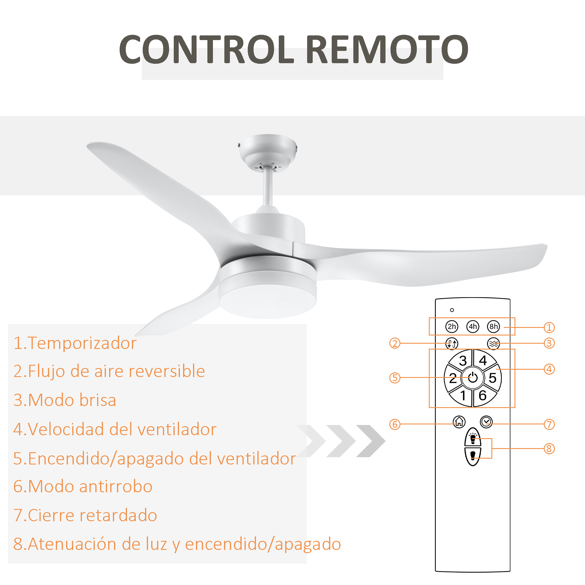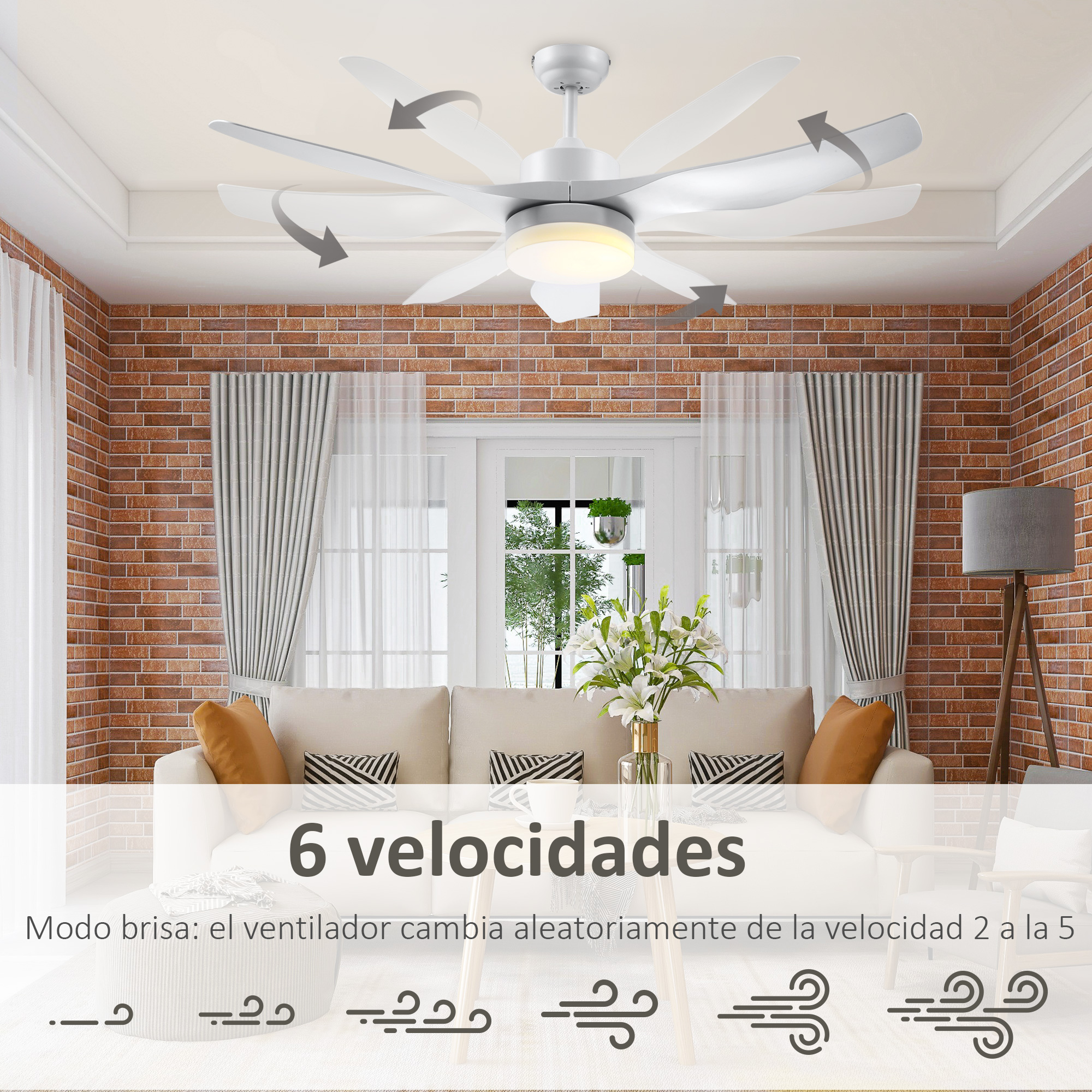 Dale un toque de modernidad a tu hogar con este ventilador de techo con luz de HOMCOM. Ideal para usar tanto en verano para refrescarte o en invierno para potenciar el efecto de tu calefacción. Este ventilador de techo con carcasa y aspas de plástico ABS, cuenta con una luz con una vida útil de hasta 50000 horas y un mando a distancia para que puedas configurar el ventilador y la luz cómodamente desde la cama o el sofá. Características: Ventilador de techo con 6 velocidades y modo brisa que cambia aleatoriamente de la velocidad 2 a la 5 La inversión de giro de las aspas de plástico permite que el aire fluya más rápido en verano, y que en invierno las aspas impulsen el aire del techo al suelo para un calor más uniforme Con 3 colores de luz: 3000K blanco cálido, 4000K blanco y 6000K luz LED blanca fría Luz con una vida útil de 50000 horas aprox. y ventilador silencioso (máx. 43 dB) El modo antirrobo alterna el encendido y apagado de la luz para disuadir a los ladrones al creer que hay alguien en casa Requiere montaje Especificaciones: Color: blanco Material: acero, ABS y vidrio Medidas totales: Ø132×40 cm (DxAL) Medidas de una sola aspa: 61,5×13,5 cm (LxAN) Longitud del cable de alimentación: 30 cm Alcance del mando: 10 m Adecuado para: 2,8-3 m (altura del techo), 20 m² (espacio) Nivel de ruido: 43 dB Brillo: 1500 lúmenes Temperatura de color: 3000K/4000K/6000K Vida útil: 50000K Voltaje: 230 V / 50 Hz Potencia: 20,5 W (total), 16 W(luz) Baterías: 2 pilas AAA (incluidas) Referencia: B31-392WT El paquete incluye: ● 1 x Ventilador de techo con luz; ● 1 x Mando a distancia; ● 1 x Manual de instrucciones